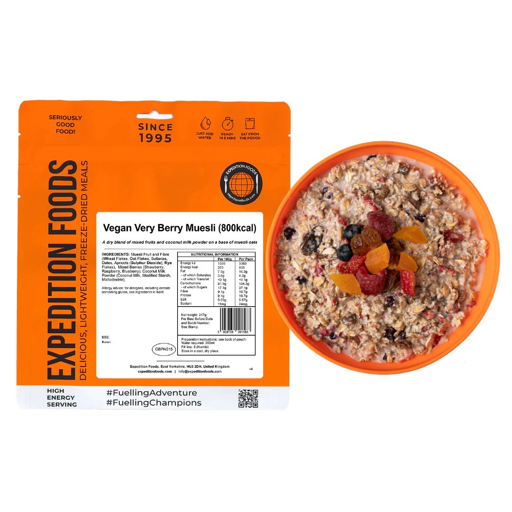 Traditional muesli and fibre mixed with sultanas, dates, apricots, strawberries, raspberries and blueberries. With coconut milk used as a replacement for traditional milk, this aptly named Very Berry Muesli is sure to please every health-conscious hiker or explorer on the planet. A sumptuous breakfast for vegans, vegetarians and everyone who enjoys a nutritious start to an active day. Enjoy from anywhere.
