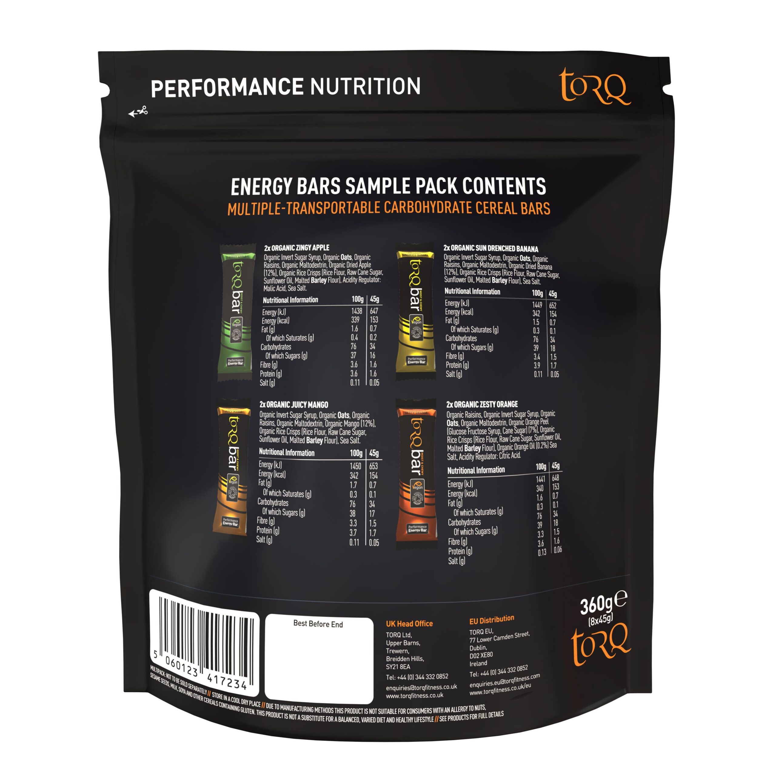 This special 8 bar sample pack provides you with 2 of each TORQ bar. All products are certified Organic by the Soil Association.